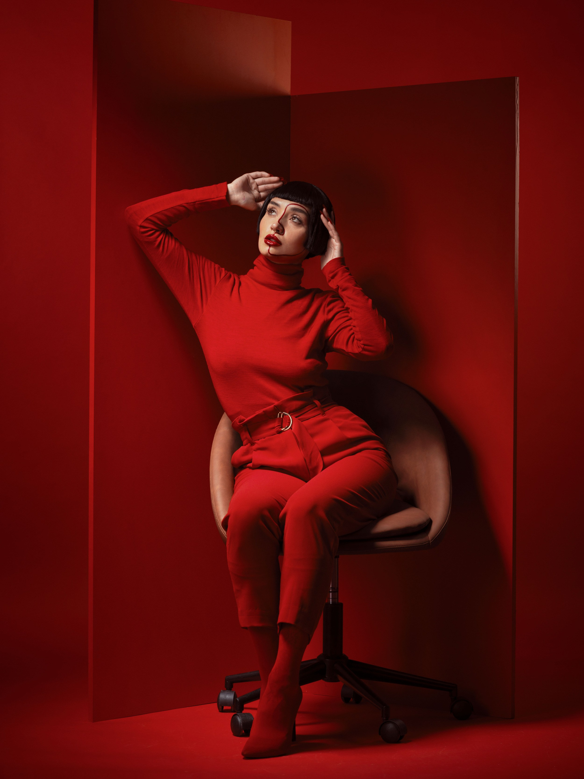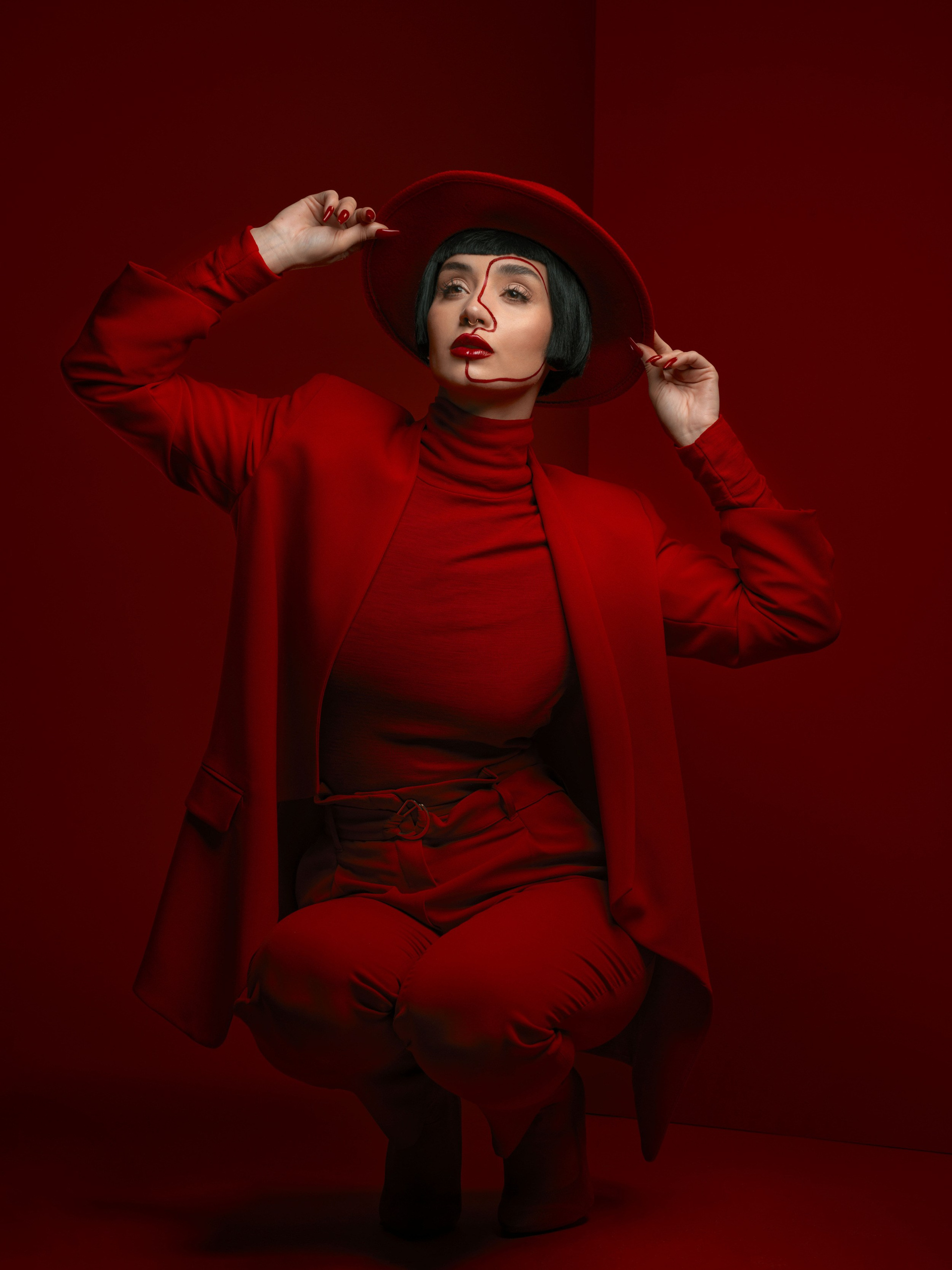 Эта фотосессия стала для меня невероятным опытом. С самого начала я почувствовала, что концепция — полностью погрузить меня в красный мир — даст возможность проявить эмоции и характер на максимуме. Каждый образ был продуман до мелочей: одежда, аксессуары и даже фон создавали единое художественное пространство, в котором я могла свободно экспериментировать с позами и настроением.