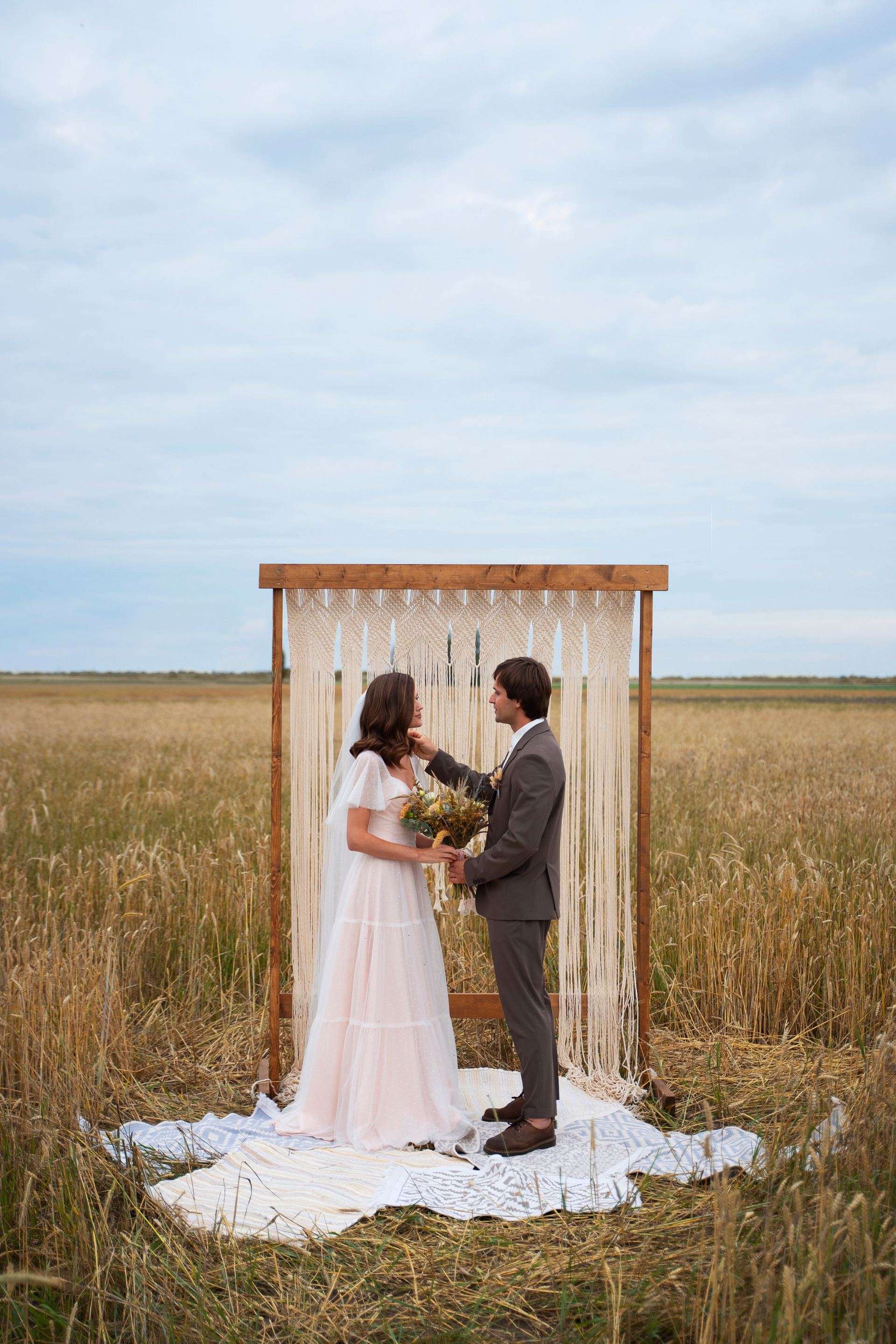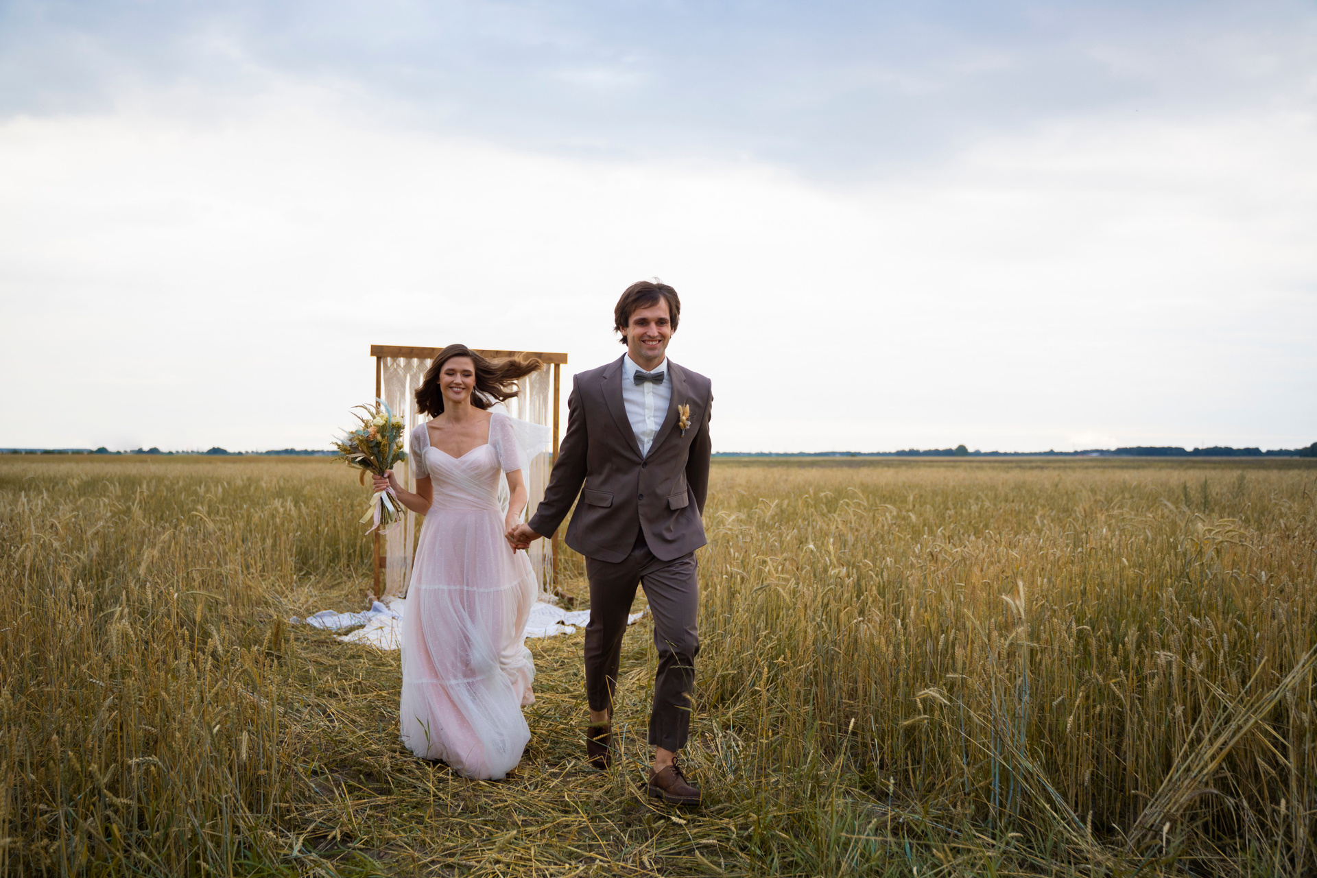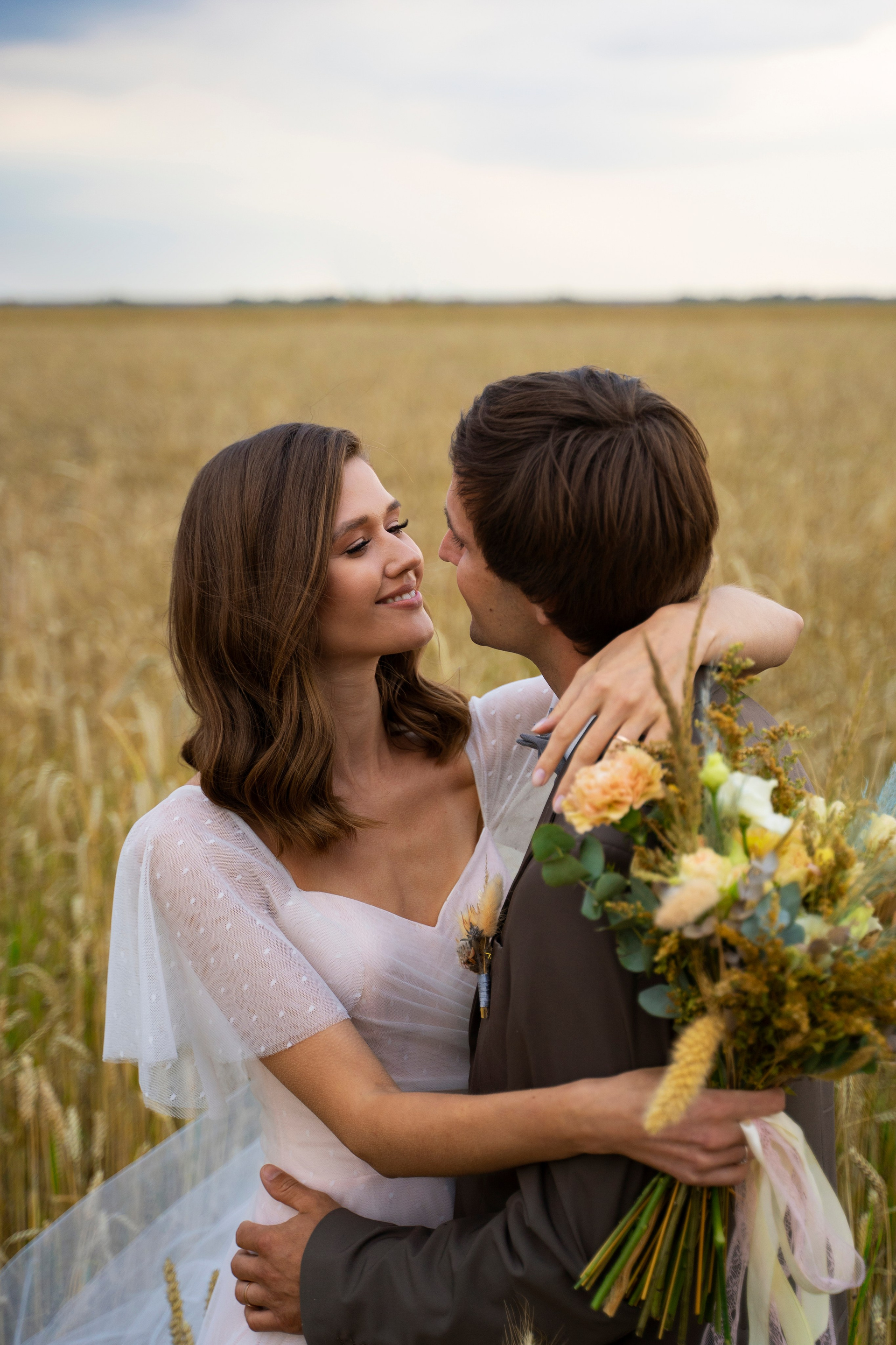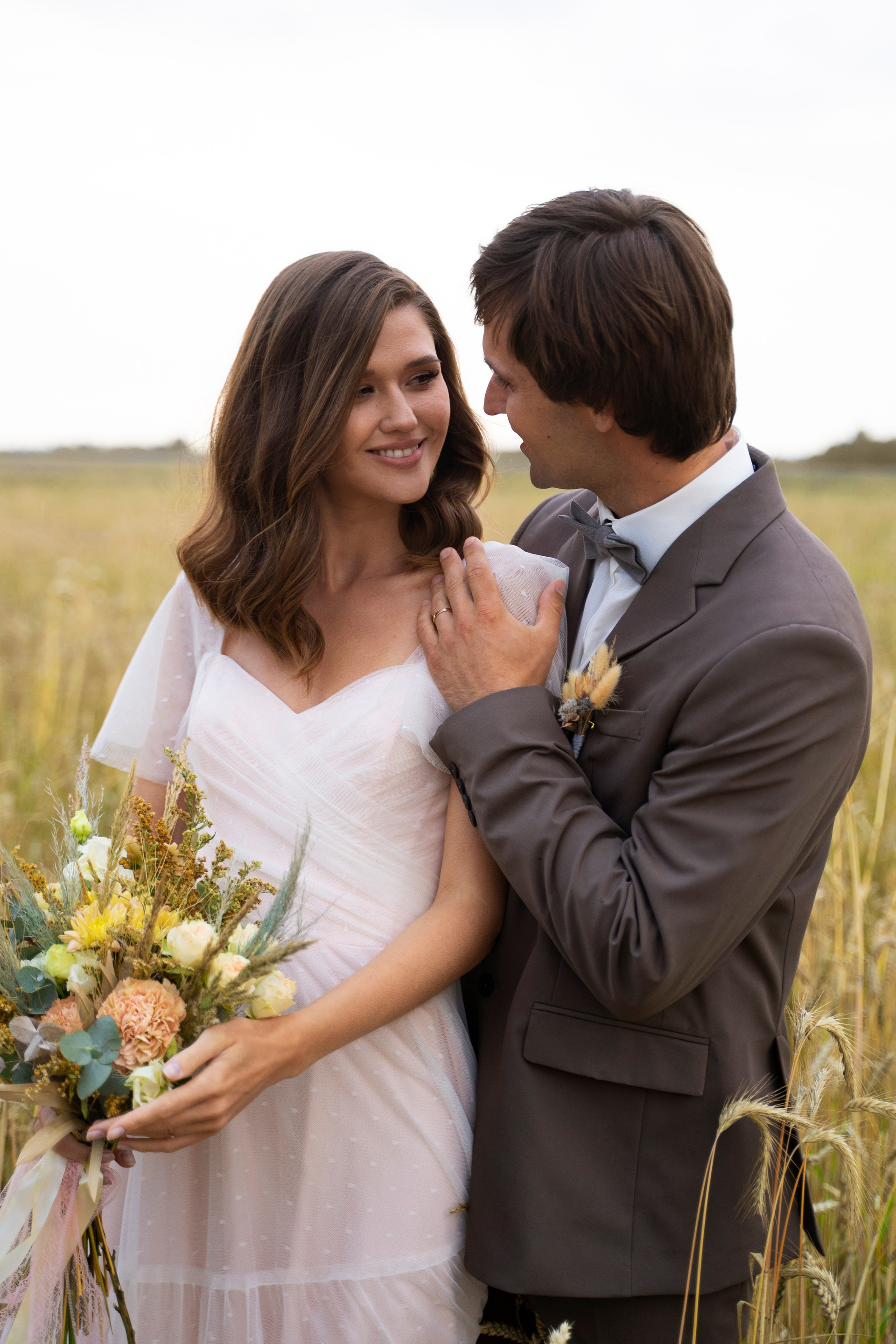 Эта свадьба — о настоящей нежности и гармонии. Просторное поле, колосья пшеницы и лёгкий ветер стали самой искренней декорацией для истории двух сердец. Здесь нет пафоса — только любовь, свет и спокойствие природы вокруг.
