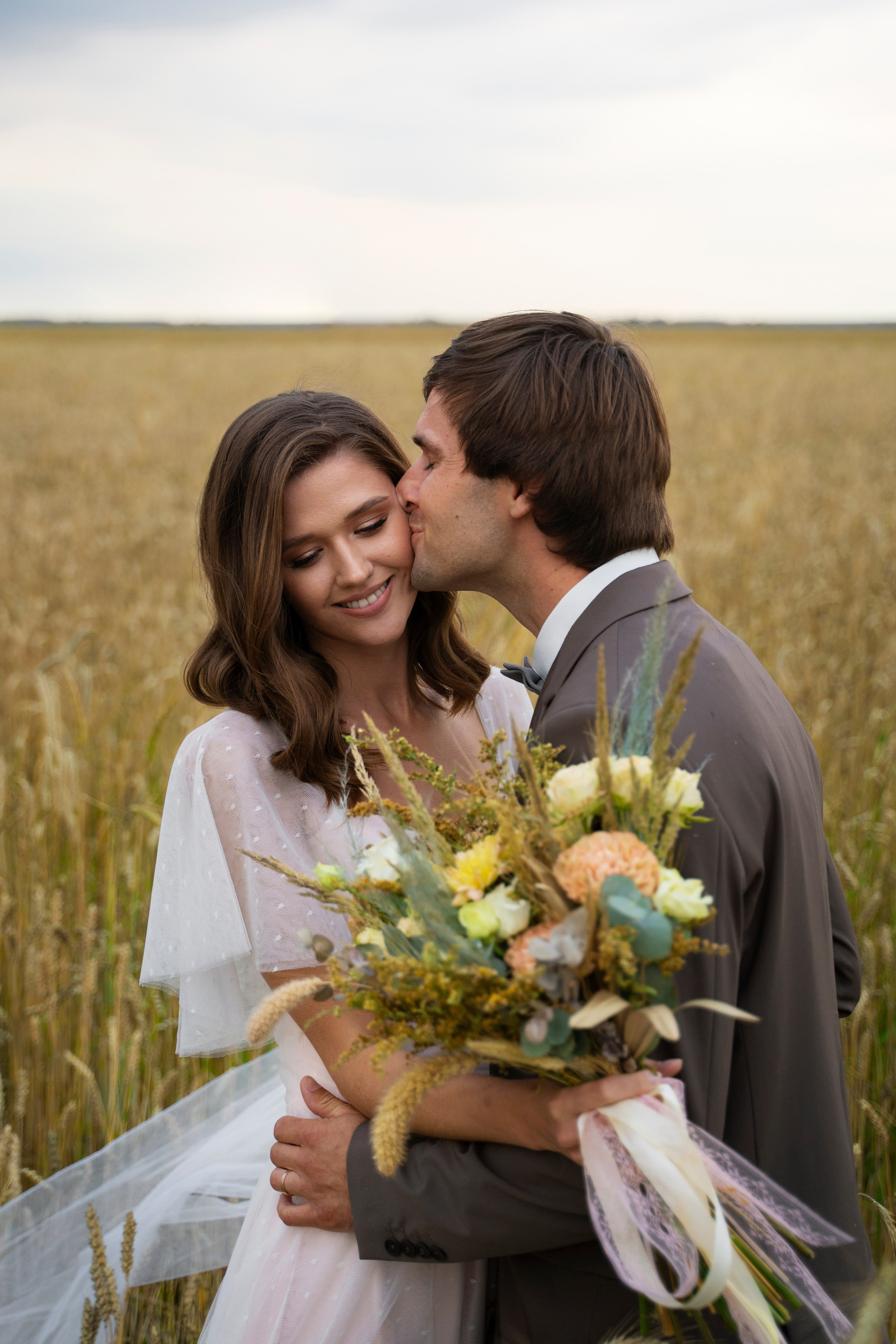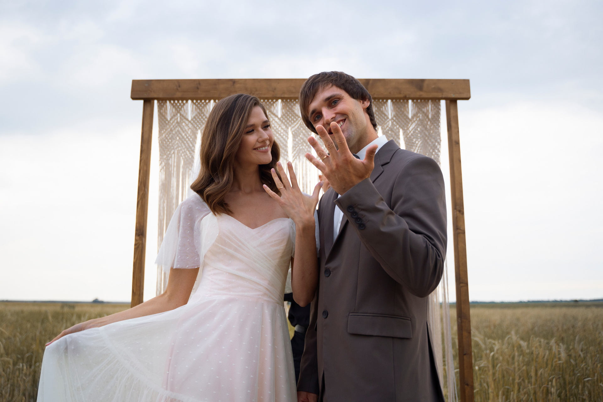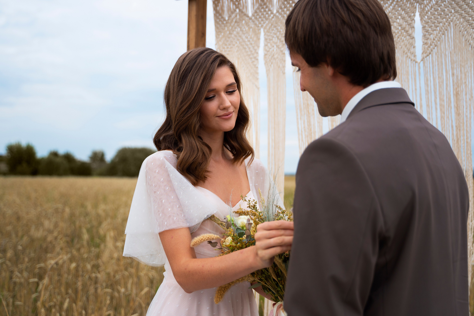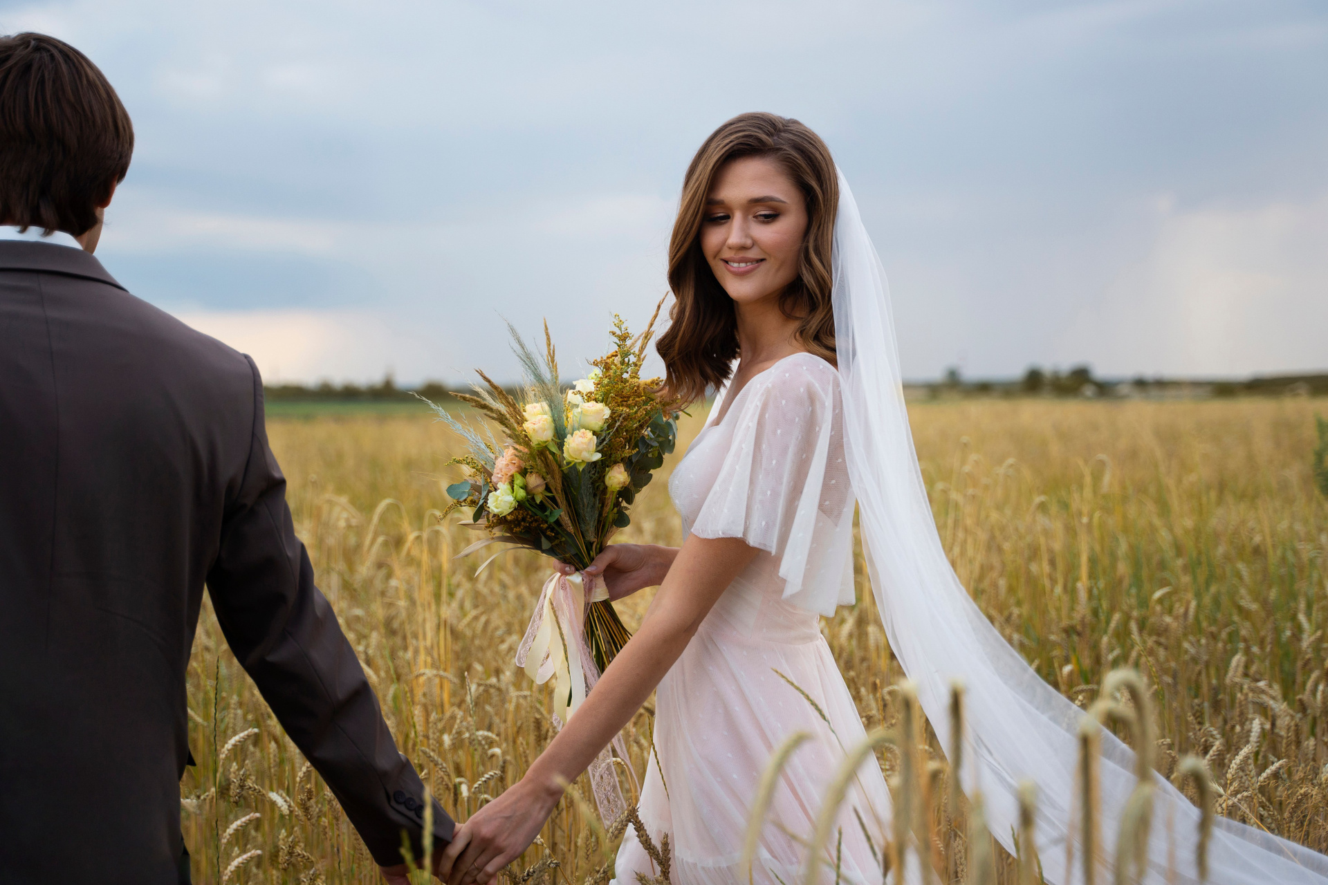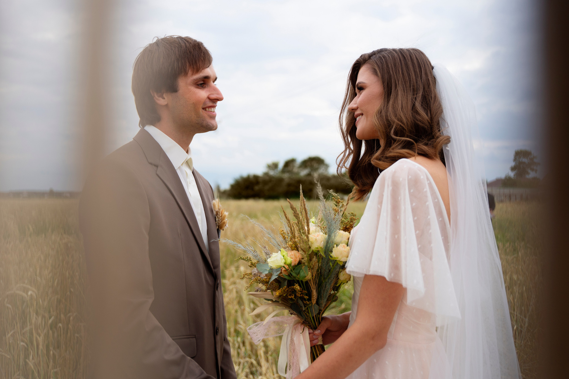 Эта свадьба — о настоящей нежности и гармонии. Просторное поле, колосья пшеницы и лёгкий ветер стали самой искренней декорацией для истории двух сердец. Здесь нет пафоса — только любовь, свет и спокойствие природы вокруг.
