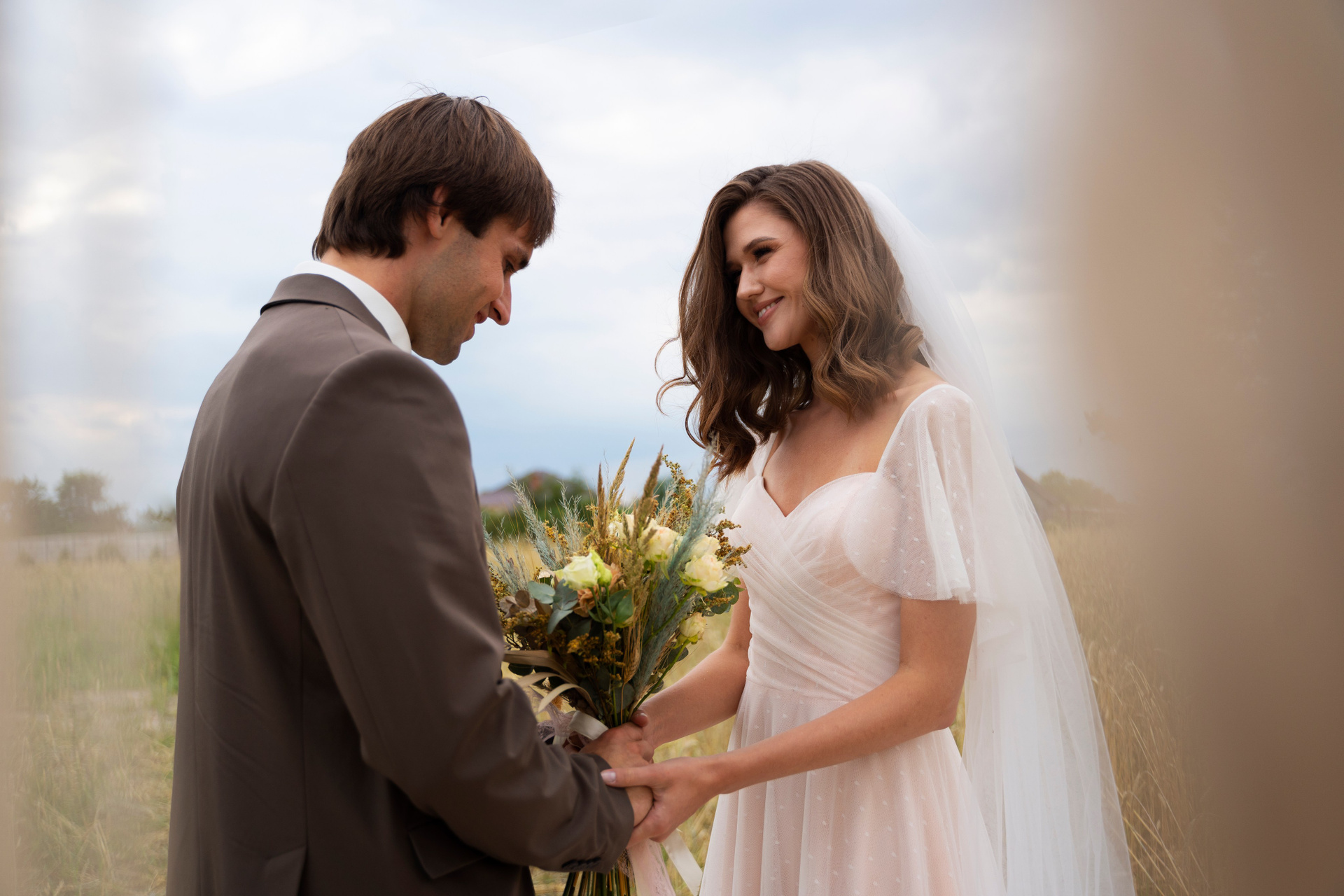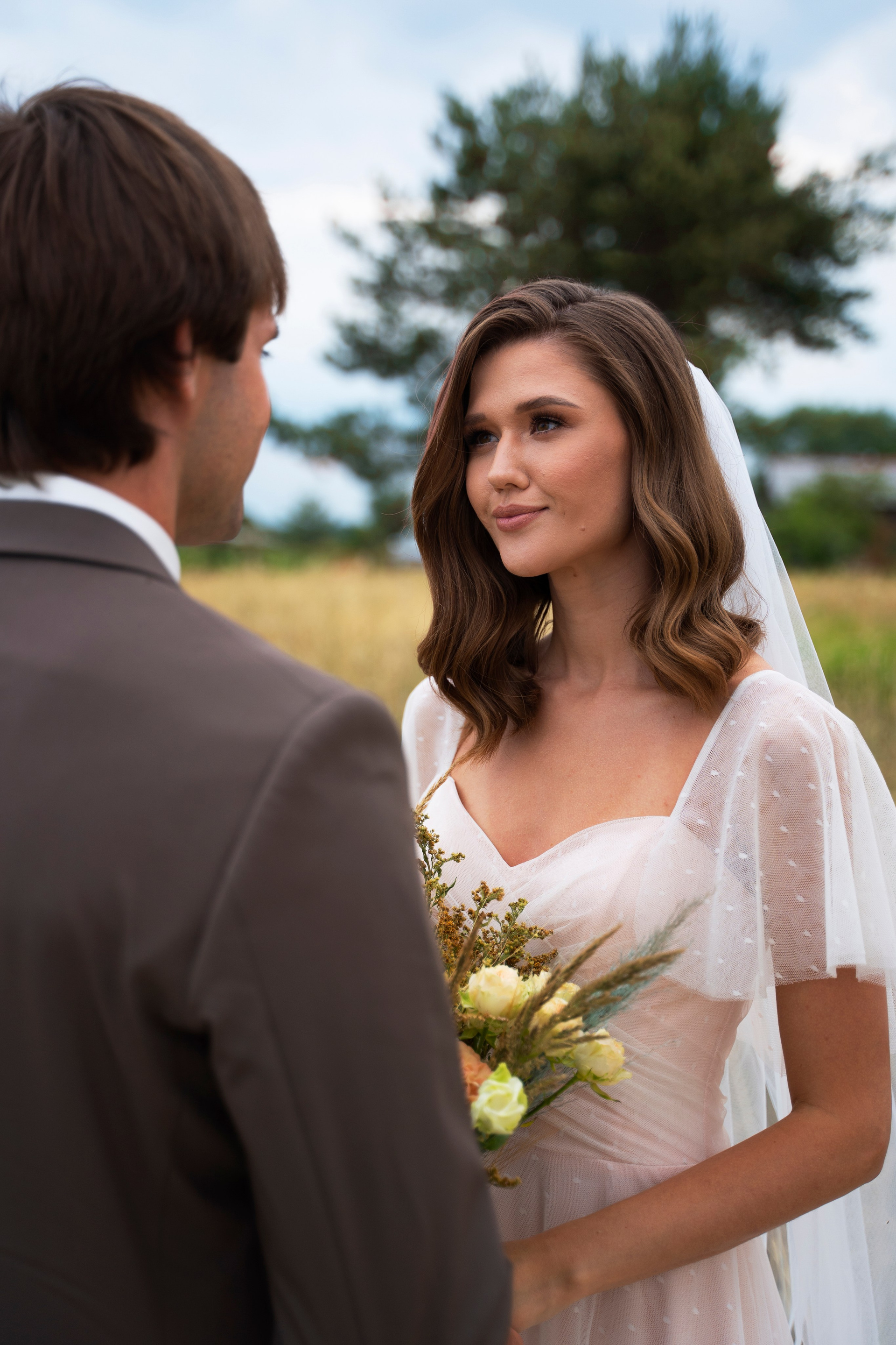 Белое платье невесты с воздушными рукавами, скромный букет из полевых и садовых цветов и искренние улыбки сделали атмосферу по-настоящему трогательной. Эти кадры — словно кадры из фильма о чистой, светлой любви.