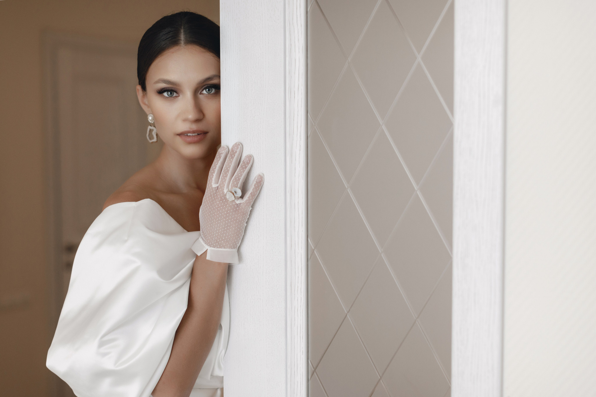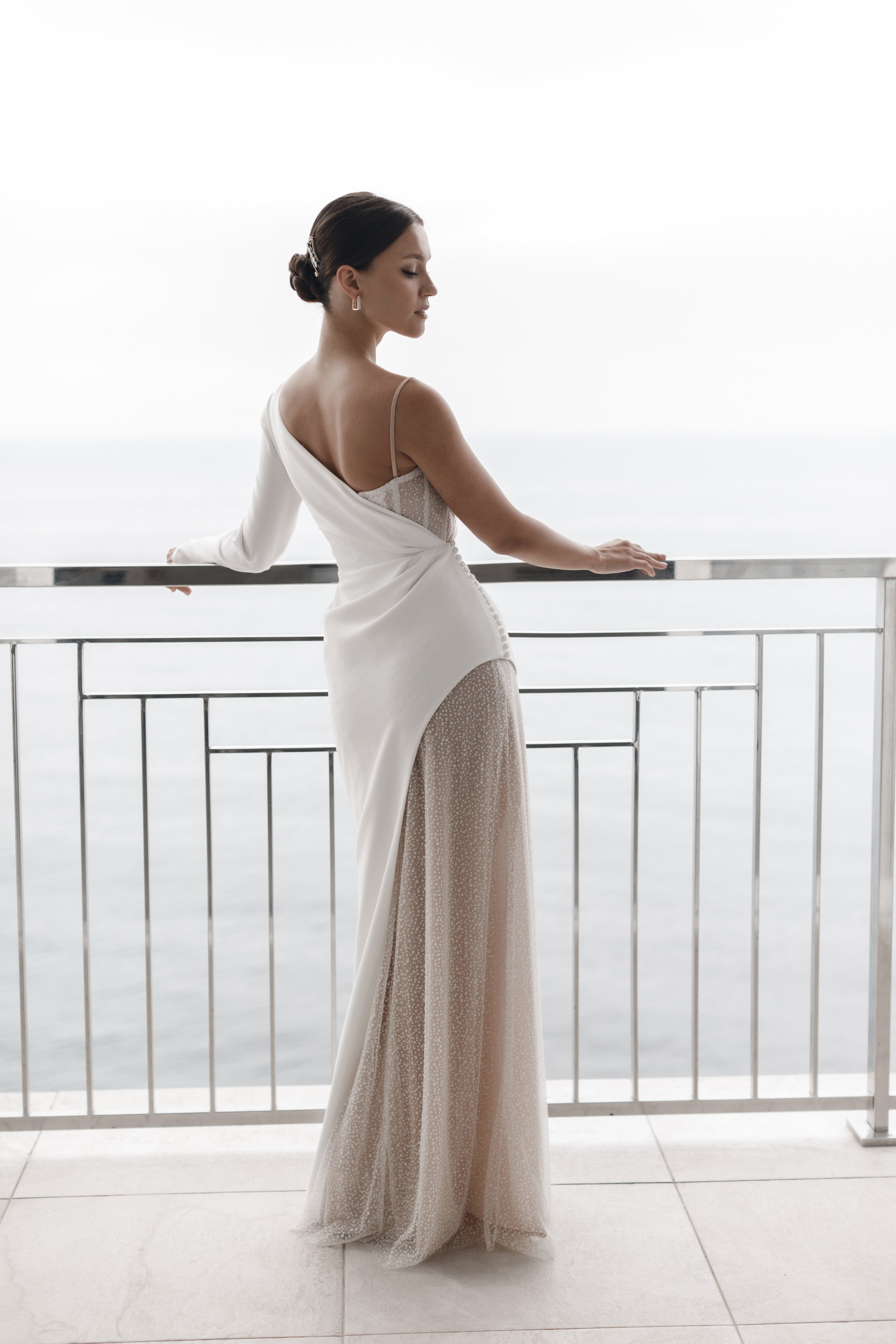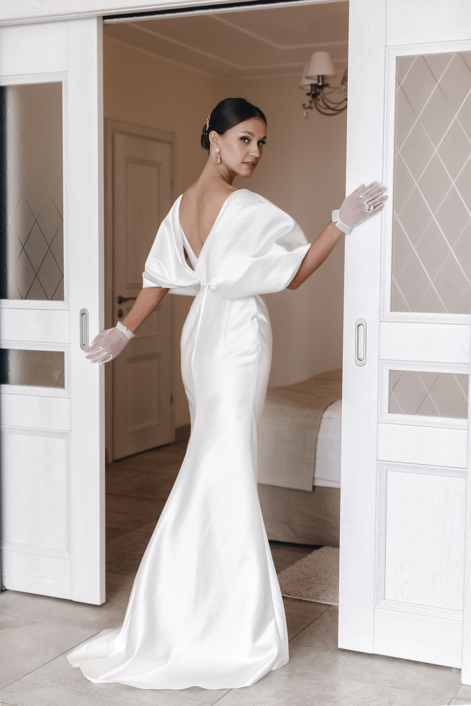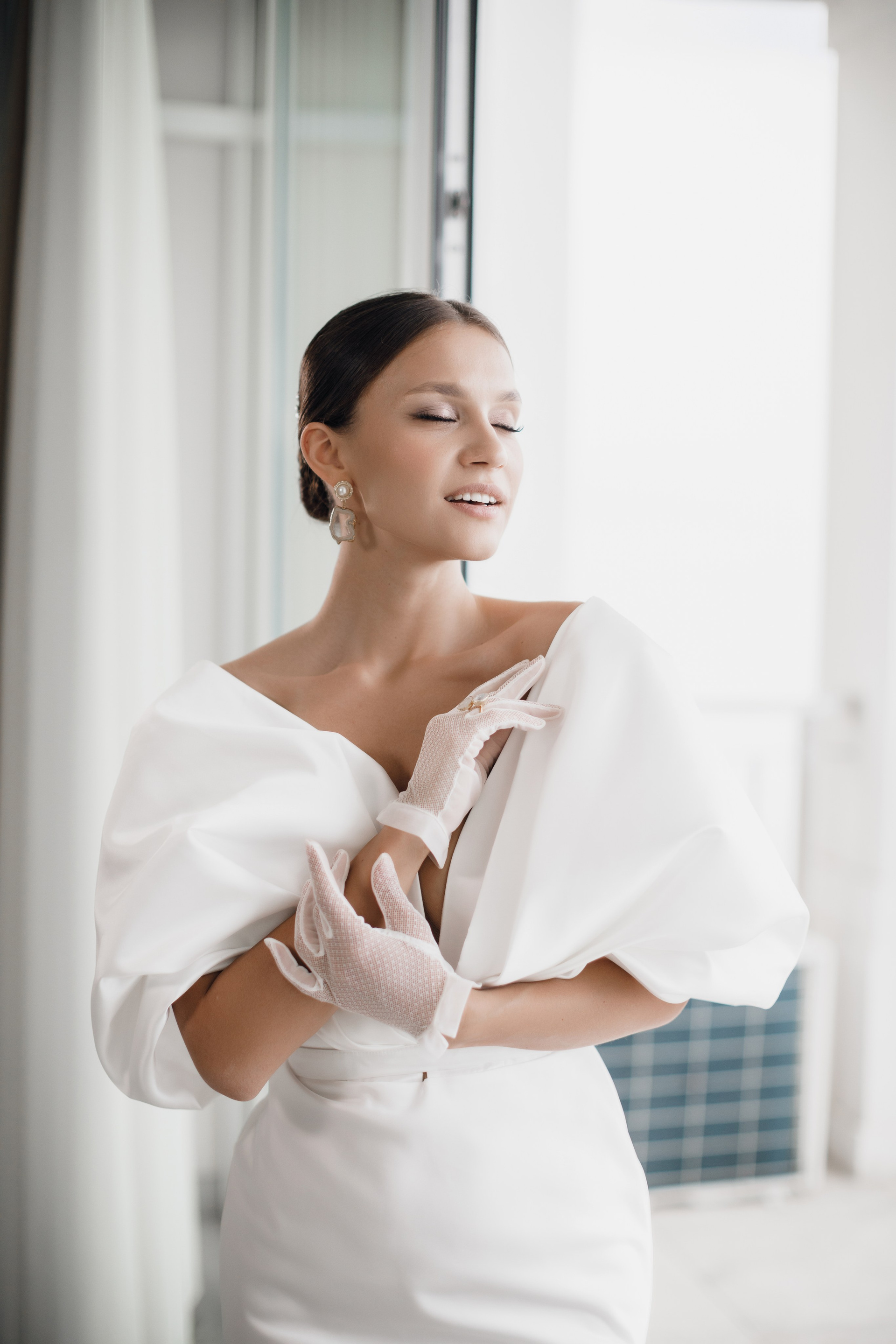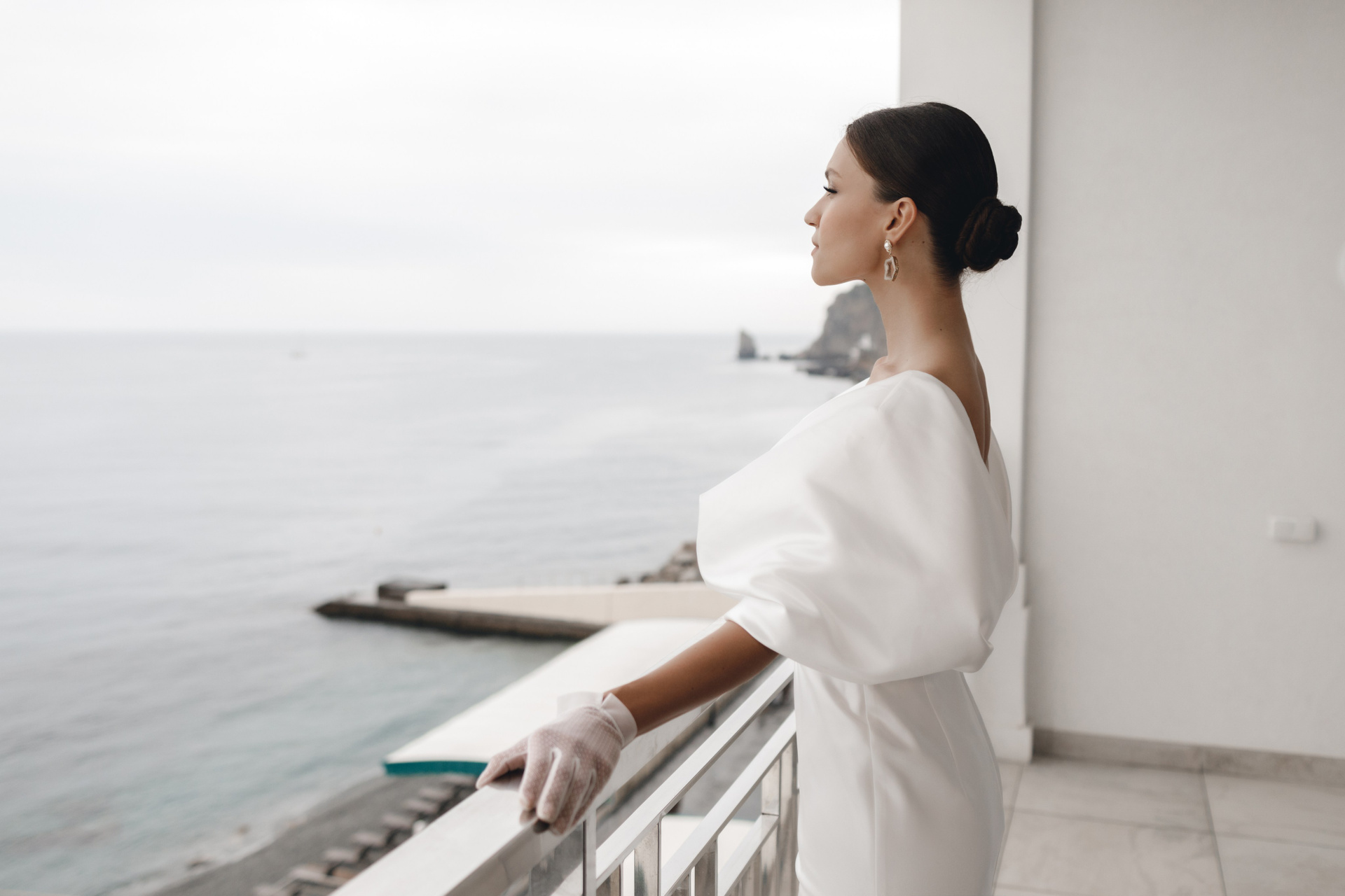 Утро невесты Дарьи получилось невероятно изысканным и стильным. Атмосфера лёгкости и роскоши сочеталась с нежностью морских пейзажей за окном. Каждая деталь — от элегантного платья с акцентными рукавами до утончённых перчаток и лёгкой фаты — подчёркивала её природную красоту и особенное настроение этого дня.